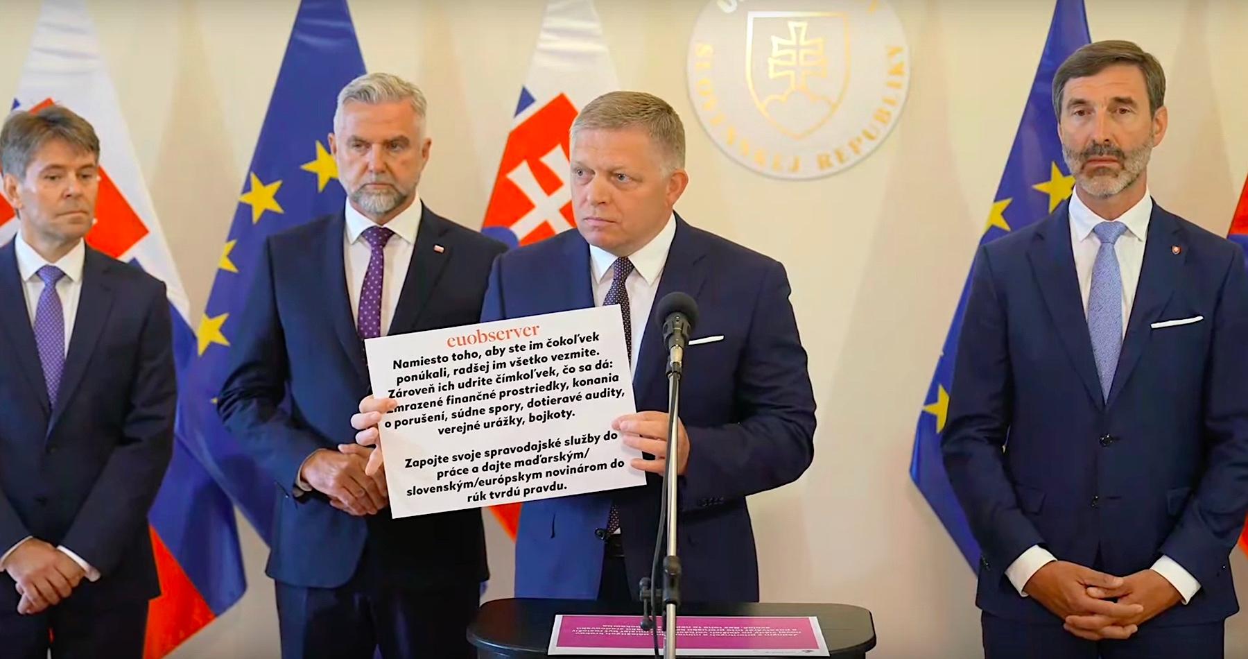 Predseda vlády v tejto súvislosti poukázal na mediálny nátlak zo strany probruselského spravodajského portálu EUobserver, ktorý koncom júna vyzval EÚ na „vojnu“ proti slovenskej a maďarskej vláde len preto, že odmietli podpísať 18. balík sankcií proti Rusku, kým nedostanú záruky, že zastavením dovozu ruského plynu od januára 2028 nebudeú poškodení a nebude ohrozená ich energetická bezpečnosť.